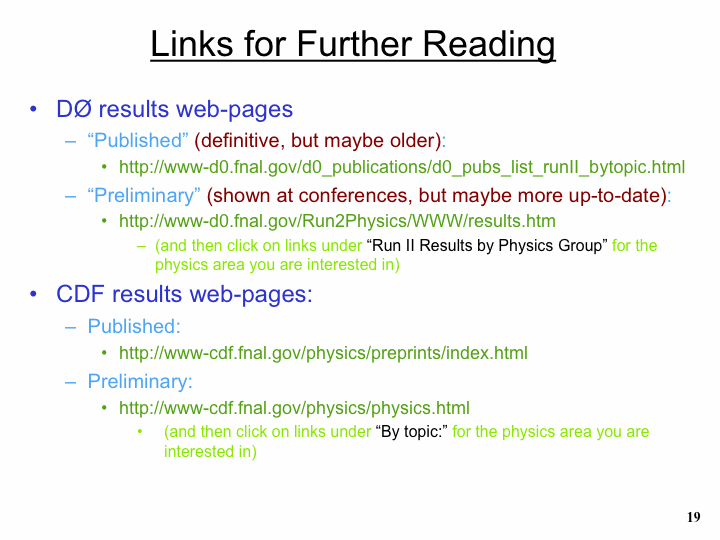 For background reading relevant to my lectures, I recommend the text book "Particle Physics" by B.R. Martin and G. Shaw (publisher John Wiley and Sons). Please note that a 3rd edition has recently been published, which is much more up to date and relevant than earlier editions. In particular, a quite good first introduction to the ideas of gauge symmetry, unification of the Electromagnetic and Weak interactions and the Higgs boson can be found in Chapter 9 and Appendix D of the 3rd edition of Martin and Shaw. As mentioned in the lecture notes, here is a short review that might be of interest to some of you as optional background reading: `High-energy colliders and the rise of the standard model', T.R.Wyatt. Nature 448 (2007) 274-280, which is available at: http://www.hep.man.ac.uk/u/wyatt/docs/nature_final_review.pdf A longer and more complete version of this review (for those interested in pursuing this subject further) is available at: http://www.hep.man.ac.uk/u/wyatt/docs/extended_review.pdf I've hopefully convinced you that you can start to read the original research literature in particle physics. Here are some useful web links